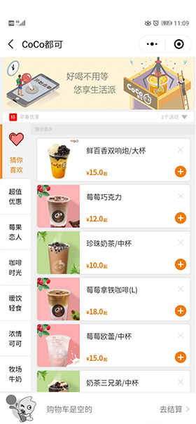 公司为奶茶点单小程序,特别针对奶茶行业特点而设计,为您提供高品质效果呈现与电商化技术服务